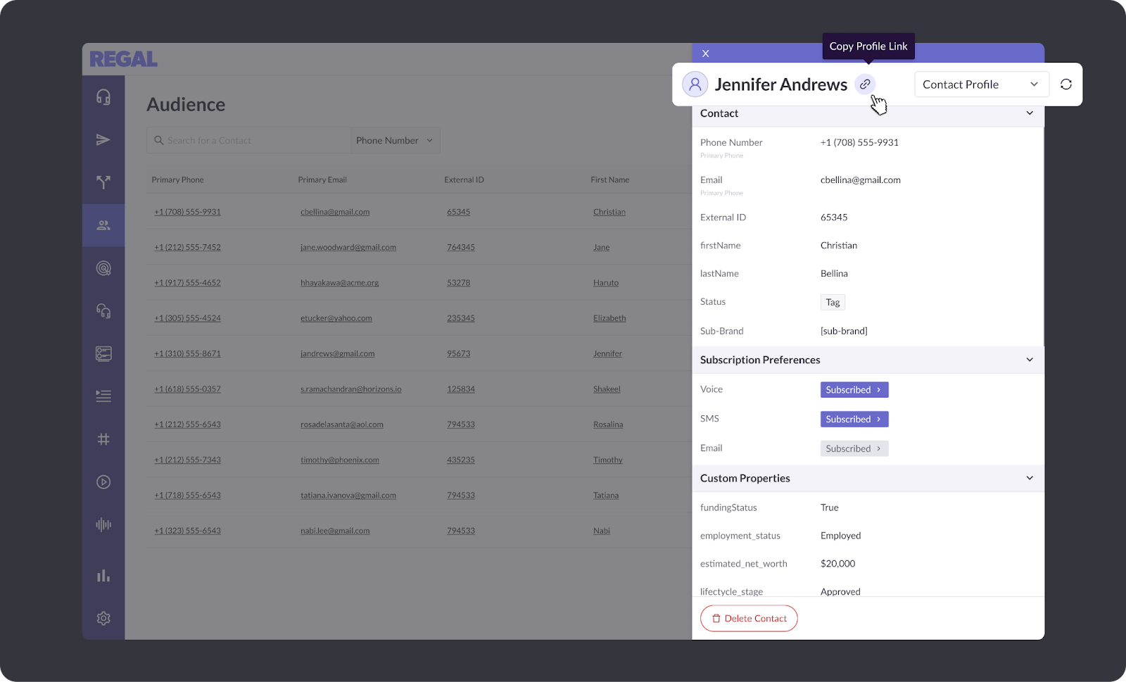 Individual Contacts now have dedicated URLs, which makes it easier for Regal admins to share Contact information by providing a direct link. With the URL, admins can share contact profiles with each other with a simple copy/paste of the URL. External CRMs can also be set up to link directly to a Regal contact profile.