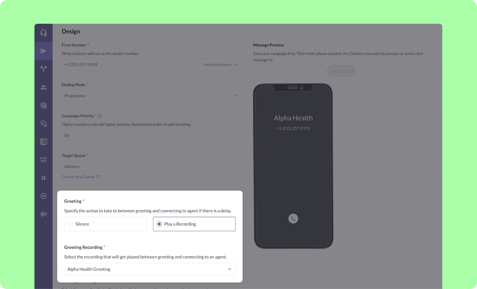 When setting up a Progressive Dialer campaign, admins can now upload a recording to play after a contact’s greeting until an agent connects to the call. This creates a more seamless experience for the contact that minimizes any perceived delay of getting connected to the agent while Answering Machine Detection is performing, reducing the likelihood of hangups and in turn, the campaign’s abandon rate.